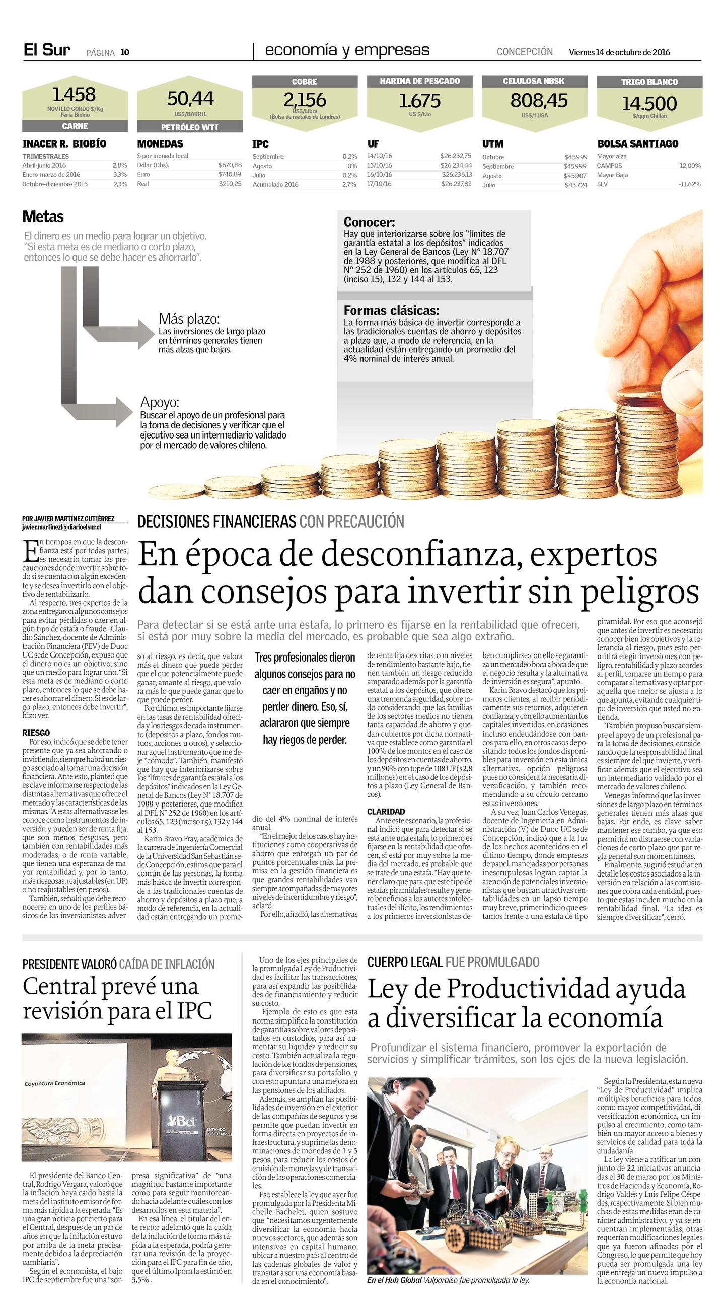 Al respecto, tres expertos de la zona entregaron algunos consejos para evitar pérdidas o caer en algún tipo de estafa o fraude. Claudio Sánchez, docente de Administración Financiera (PEV) de Duoc UC sede Concepción, expuso que el dinero no es un objetivo, sino que un medio para lograr uno. “Si esta meta es de mediano o corto plazo, entonces lo que se debe haceres ahorrar el dinero. Si es de largo plazo, entonces debe invertir”, hizo ver.